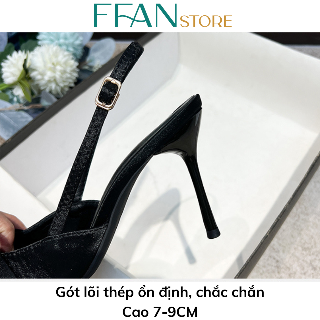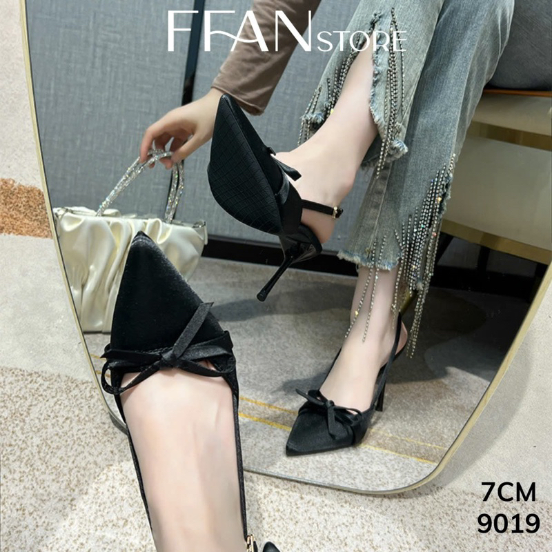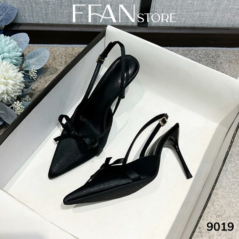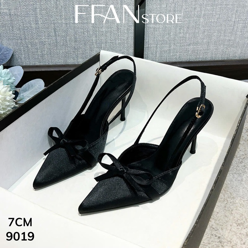Hãy là người đầu tiên nhận xét “Giày cao gót mũi nhọn hở gót slingback [lụa satin mềm mại] 9019 FFAN STORE, gót nhọn 7 9 phân đính nơ big size màu đen”