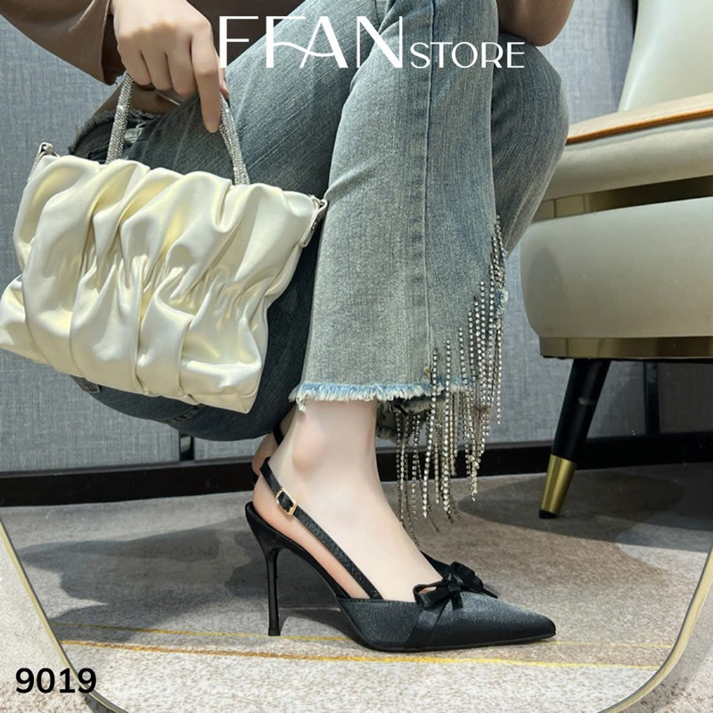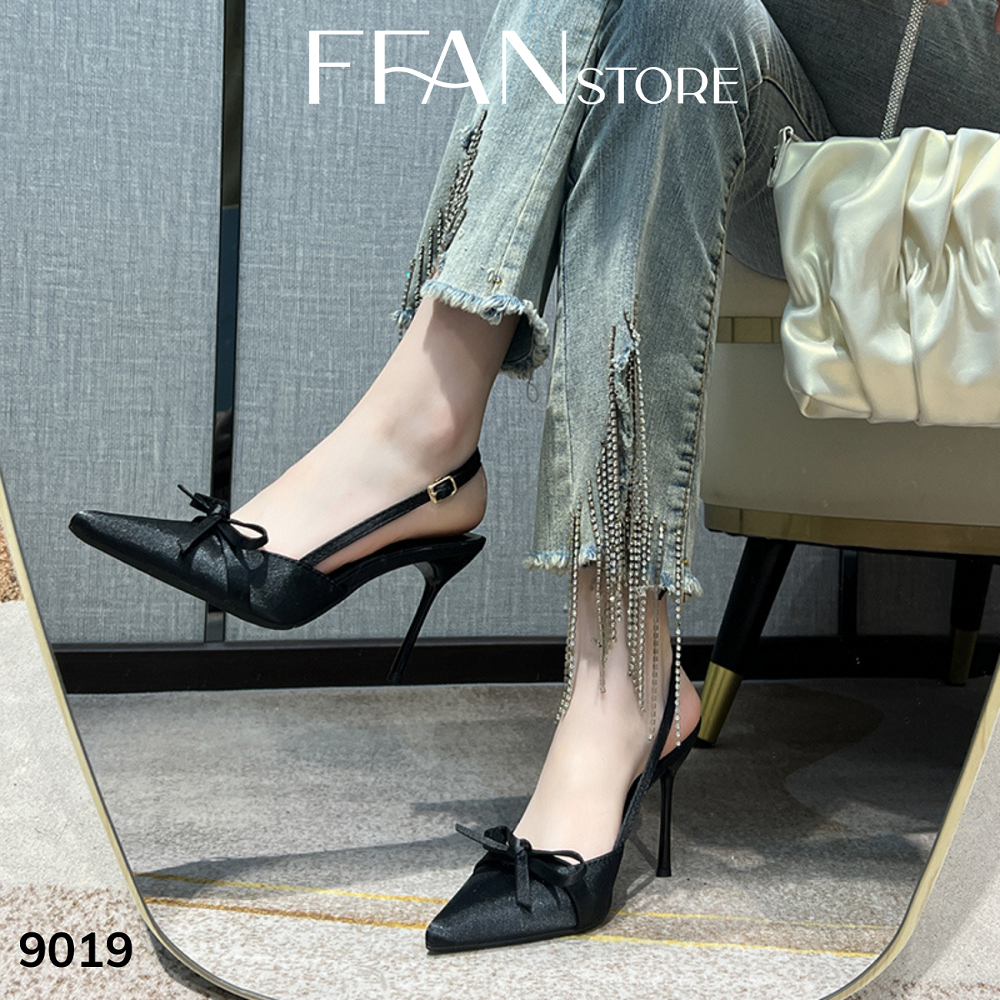Giày cao gót mũi nhọn hở gót slingback [lụa satin mềm mại] 9019 FFAN STORE, gót nhọn 7 9 phân đính nơ big size màu đen